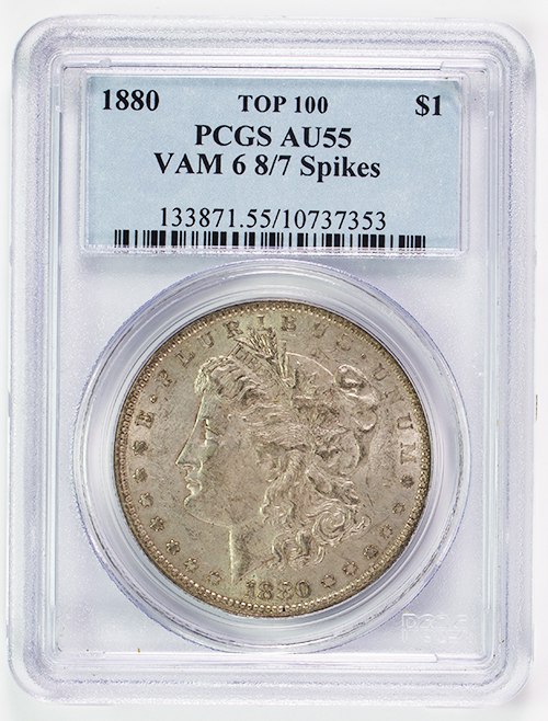 1880 Morgan Dollar PCGS AU-55 Top 100 VAM 6 8/7 Spikes